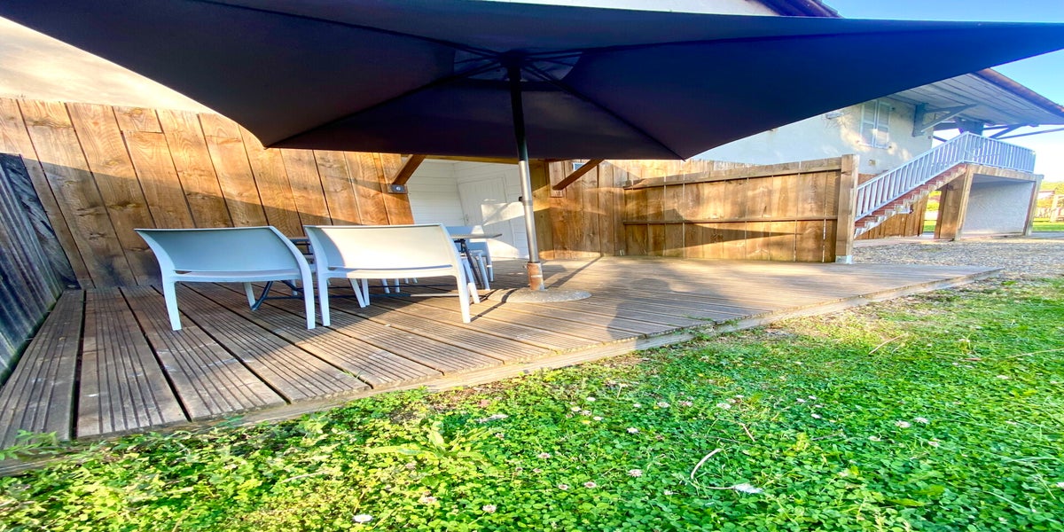 - Terrasse privative avec table et chaises, et bain de soleil