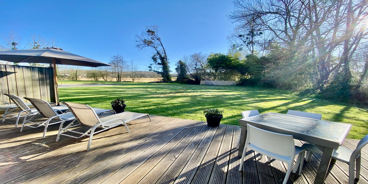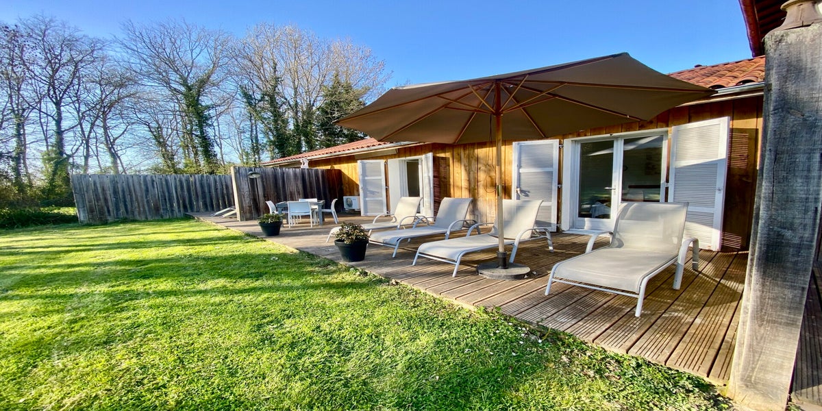 - Terrasse privative avec table et chaises, et bain de soleil